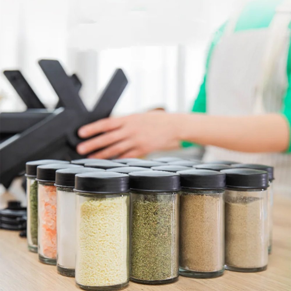 • يحتوي رف التوابل على 18 برطمان زجاجي بقطر كبير 100 مل، ورف توابل واحد يمكنه استيعاب جميع تخزين التوابل في المطبخ.