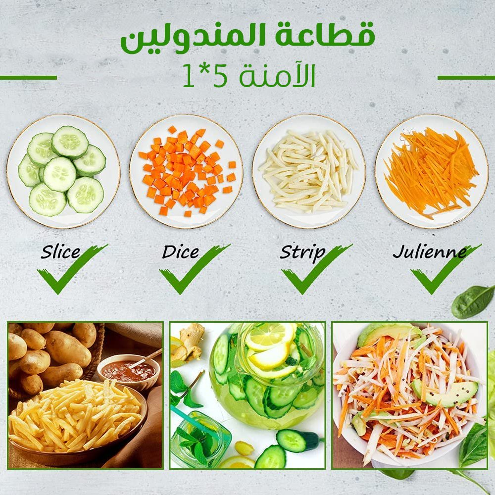 • اختصر وقتك بالمطبخ! مع قطاعة المندولين الآمنة 5 في 1 بتنجز الشغل بسرعة وبدون تعب.