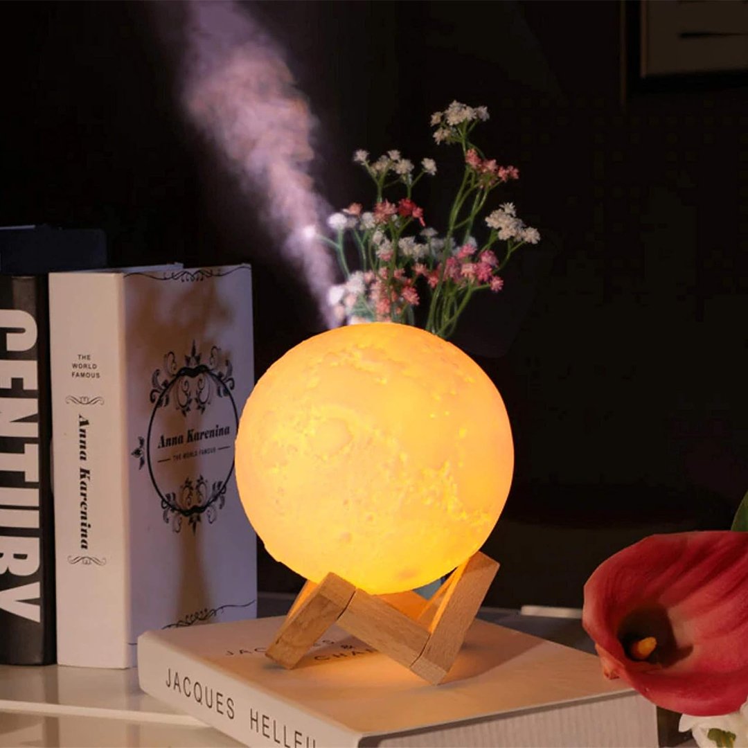 • أضف لمسة سحرية لجو منزلك مع مرطب هواء على شكل قمر. استمتع بالرطوبة اللطيفة والهواء المنعش في كل غرفة.